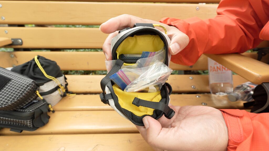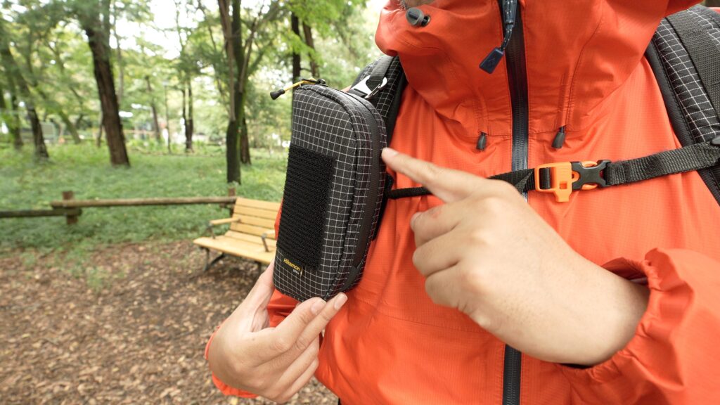 カラビナとダブルベルクロでバックパックのショルダーにガッチリ固定でき、歩行中の揺れも最小限に抑えられます。メインポケットには内ポケット付きで、スマホを保護しながら収納可能。スマホに加え、行動食、ファーストエイドキットまで余裕で収納できる大容量設計。前面メッシュポケットはスマホホルダーとしても便利。サイズ調節機能により500mlペットボトルもしっかりホールドしてくれます。止水ジッパー採用で急な雨にも対応できる、まさに全部入りの神ポーチです。