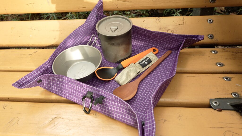 折りたたみ時はコンパクトながら、展開すると34cm四方のシートに変身する変幻自在のアイテム。スナップを閉じるとクッカー類はもちろん、散らかりがちなカトラリーやエバニューの長めのスプーンも余裕で置ける広さ。防水性を活かして、休憩時の座布団代わりにも使用可能。キャンプ場で地面にバックパックを直置きしたくない時の保護マットとしても活躍します。この素材でこの価格は素材代だけで赤字では?と心配になるレベル。セールでは10%オフの1,422円でした。