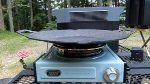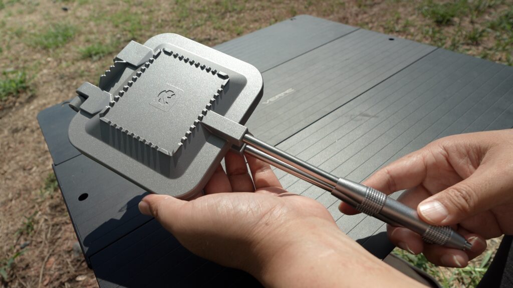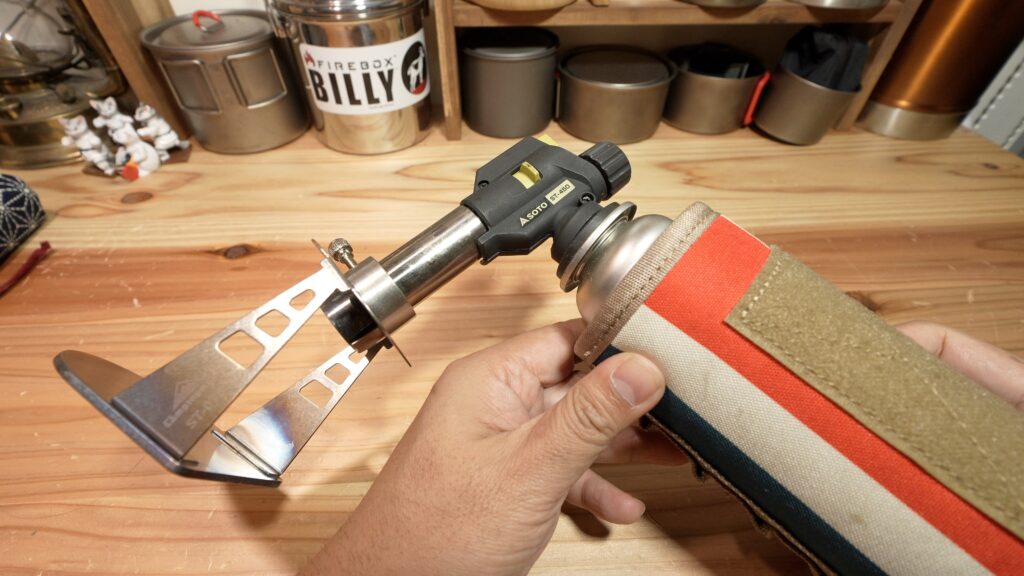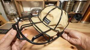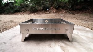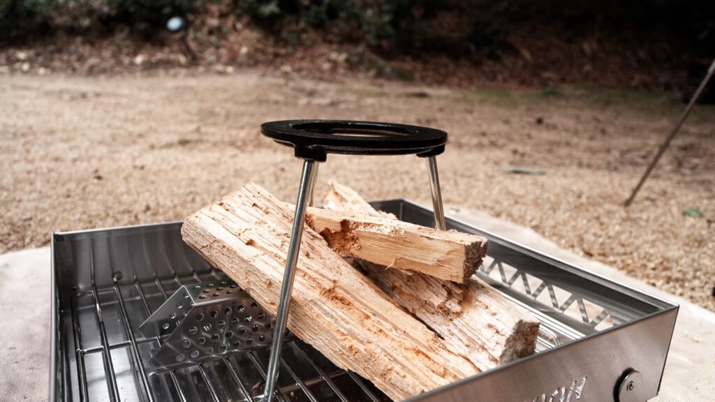 フライヤーディスク向けに作られた五徳ですが、キャンピングムーンの焚き火台とも相性抜群。収納がコンパクトで、足を3本ねじ込むだけで頑丈な五徳になります。