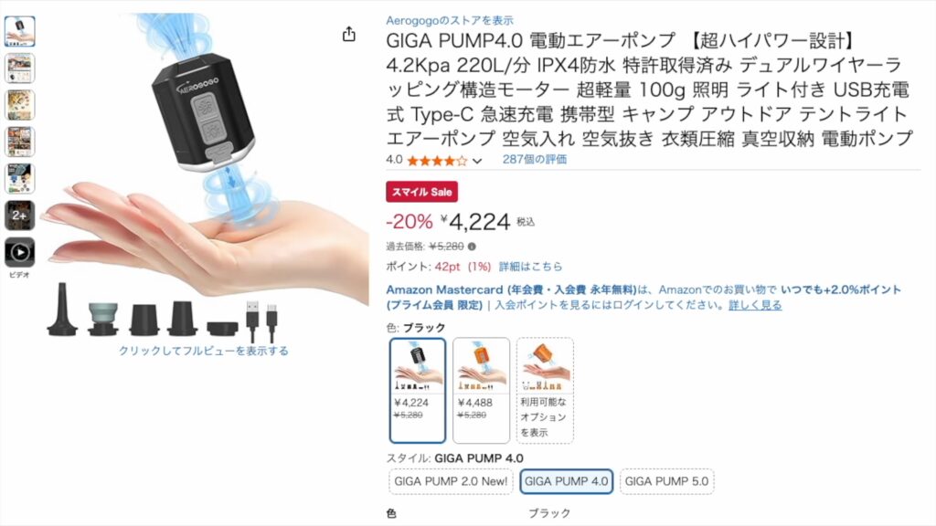 重量100g、ライト付きでランタンとしても活用可能。エアマットの空気入れに最適なパワフルポンプです。
