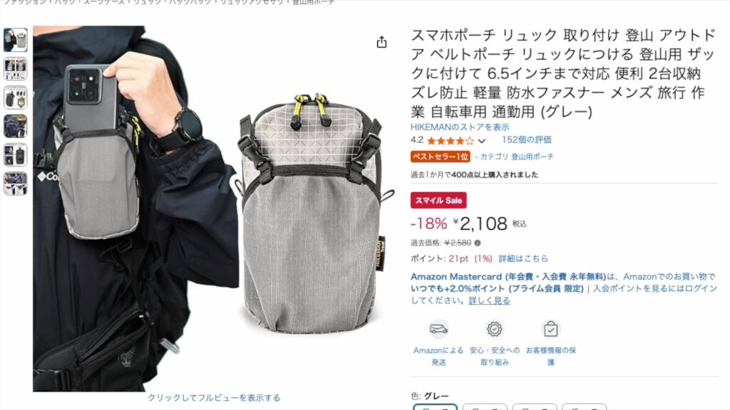 バックパックのショルダーに取り付けるタイプ。スマホ2台+ペットボトルも収納可能な大容量設計です。