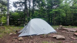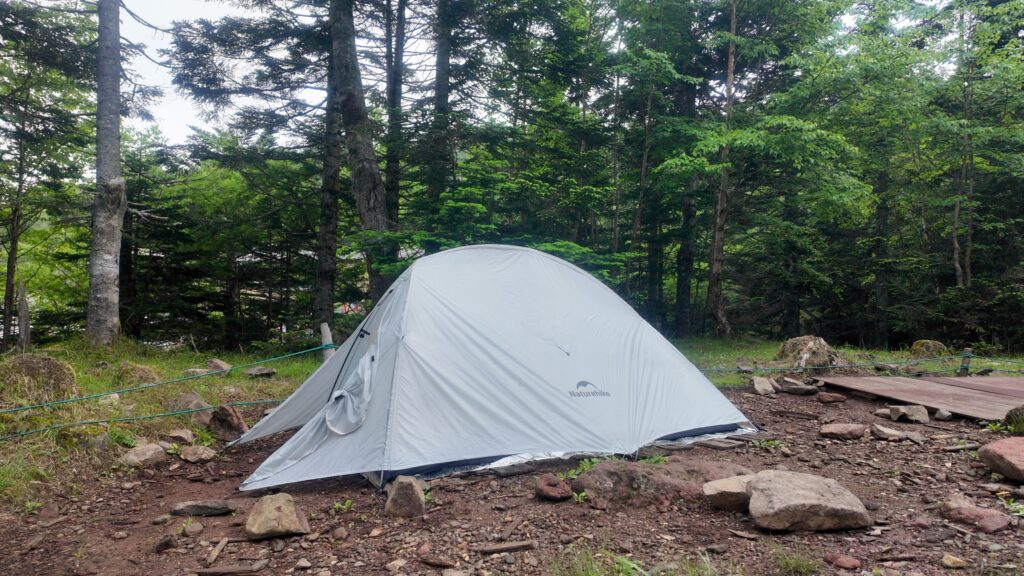 初めてのテント泊登山で使用した思い出深いテント。二人用で最小重量1.22kg、インナーサイズ130×210cmとゆったり設計です。