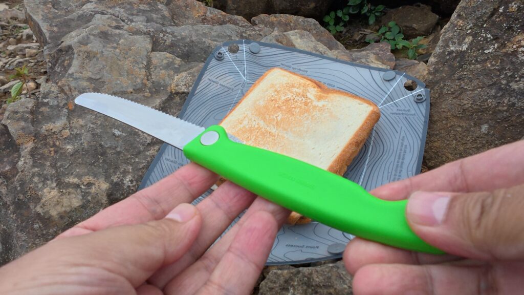 刃渡り11cm、重量42gの折りたたみナイフ。波型ブレードでホットサンドもサクサク切れる優れものです。