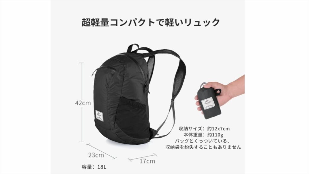 手のひらサイズに収納でき、重量わずか110g。里山ハイキングならメインバッグとしても使用可能な実用性の高さが魅力です。