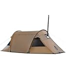 36,900円。煙突穴付きで薪ストーブが使える本格派4シーズンテント!左右に睡眠エリア、中央に活動エリアを配置したツールーム設計で、大人2人でも超快適です。70Dナイロンに耐水圧3000mm、YKK防水ジッパー採用で雨も余裕。ダブルポール構造だから設営も簡単、ポール2本組み立ててペグ8本打つだけでOK。インナースノースカート付きで冬の防寒もバッチリ、メッシュ窓と前後ドアで夏も涼しく過ごせる万能テントです。