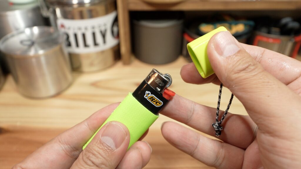 880円。重さわずか3gの樹脂製防滴ライターキャップ。Bicミニライターやスリムライターにピタッとはまって、雨や湿気から着火部をガード。フリント式ライターの弱点である「濡れると着火できない」問題を完璧に解決してくれます。キャップ内部のリブが誤着火も防いでくれる親切設計。コード穴付きだから細引きを通して首から下げれば、焚き火の時にサッと取り出せて最高に便利です。