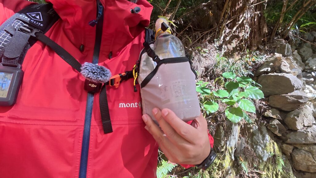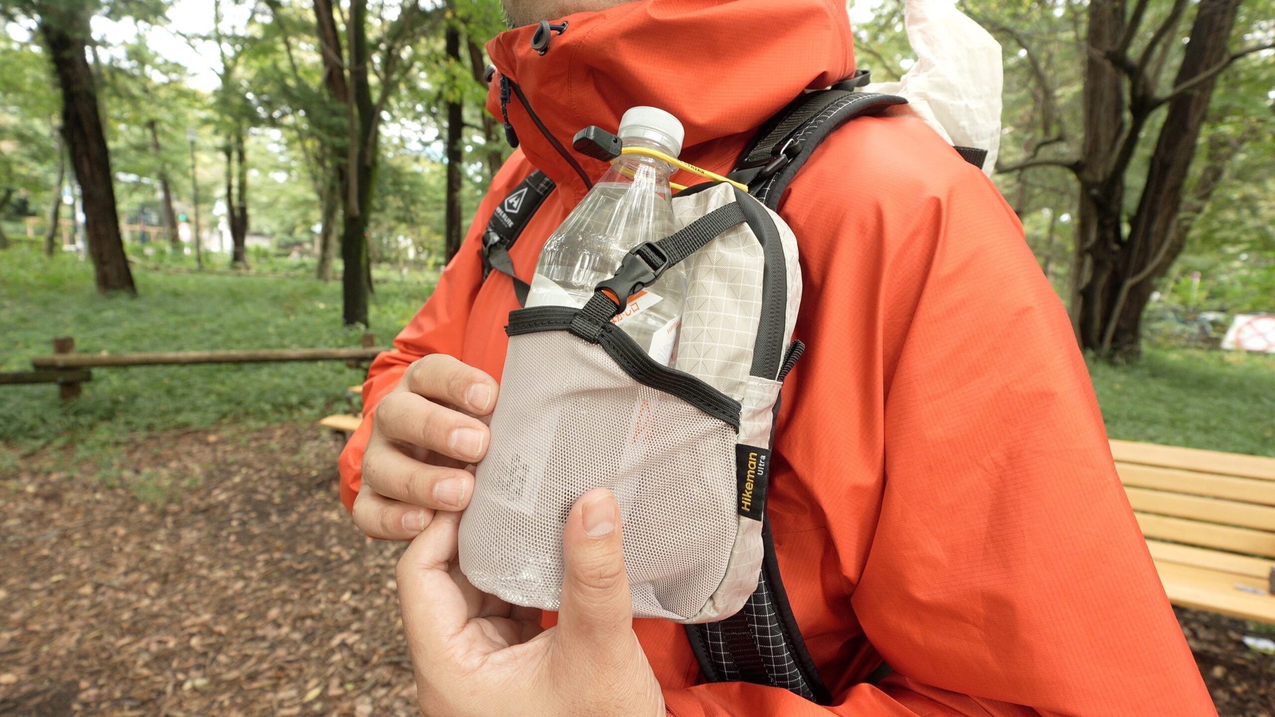 前面にメッシュポケットがついていて、ペットボトルが入るのが最大の特徴です。登山中に一番頻繁にアクセスする水分補給のボトルを前面に配置できるので、歩きながらでも片手で簡単に出し入れができます。クッションコードでボトルを固定できるので、前屈みになっても落ちません。素材はダイニーマ混紡生地で引き裂きに強く、防水ファスナー採用で小雨程度なら大丈夫。重さは82gです。