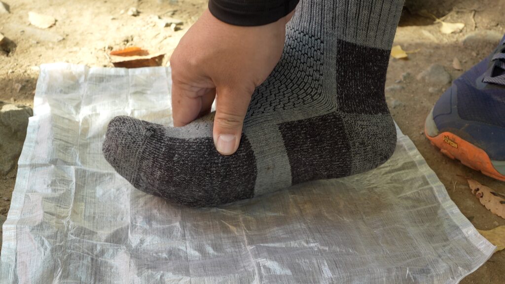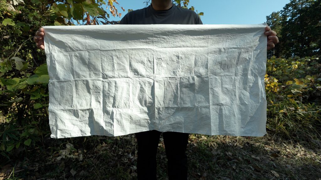 建築現場で使われる素材ですが、登山用としても優秀です。通気性があるのに防水、軽くて丈夫で重さ約22gです。滑り止め加工されているので地面においても滑りにくいのもいいところですが、風には弱いので注意が必要です。