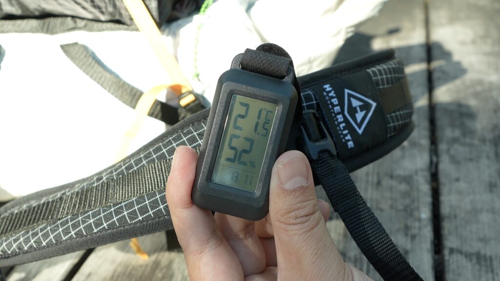 現在の気温と湿度が一目で分かります。防滴仕様(IPX4相当)なので突然の雨でも大丈夫、オレンジ色のバックライト付きで暗い場所でも確認できます。マジックテープ式のベルトでバックパックやポールに簡単に取り付け可能で、重さは約25gです。