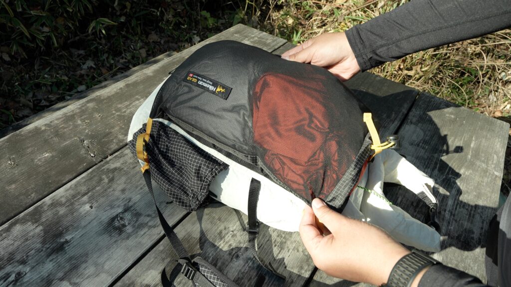コンパクトながら容量6.5Lで、バックパックの外側に取り付けられるサブバッグです。レイヤリングの度にバックパックを下ろす手間が省けて、脱いだジャケットをサッと外側に収納できます。背面がダイニーマ混紡繊維で耐水圧2400mm、もう一面はメッシュ素材で通気性抜群です。重さはたったの63gで、四隅のベルトは長さ調整可能なので、どんなバックパックにも取り付けられます。