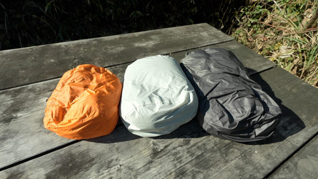 2L、4L、8Lの3サイズセットで、普通ドライバッグは1個で2,000円くらいするのに3個でこの値段です。素材は20Dのリップストップナイロンでシリコン処理されており、防水性能は5,000mm。私は2Lにはシャツ・パンツ・靴下の着替え一式、4Lにはアクティブインサレーション、8Lにはダウンジャケットをふんわり入れました。3つ合わせても重さはたったの90gです。