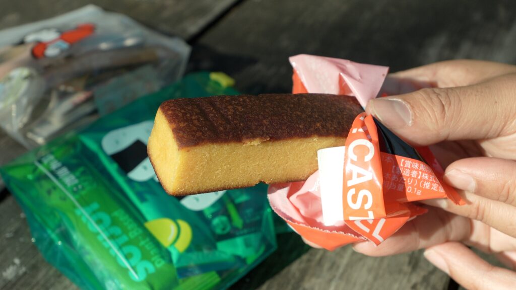 1本150kcalでたんぱく質3.2g、カステラなのにしっかり栄養補給できます。結構硬めにぎっしり詰まった感じで作られているので、バックパックの中に入れておいても潰れません。でもカステラのしっとり感はそのままで、独自製法で圧縮されているため口の中がパサつきません。原材料は卵、砂糖、小麦粉、水飴、蜂蜜の5種類のみで余計な添加物なし、保存も効くので定番になりそうです。