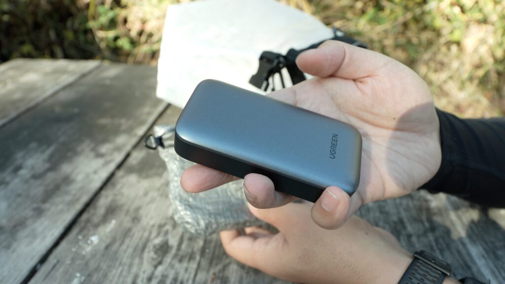 30W出力対応でiPhoneも急速充電可能、バッテリー本体への充電も約2時間でフル充電できます。重さ約180gで、10,000mAhクラスとしては軽量な部類です。マットな質感で手に持った時の感触がよく、山でも滑りにくくて落としにくいです。