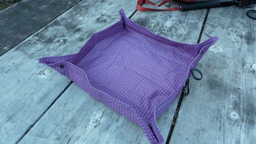 広げると34cm四方のシートになり、四隅のスナップボタンを留めると小物入れトレイに変身します。ダイニーマ混紡生地で重さは55g、防水性も高く汚れに強いです。ベンチに座るときの汚れ防止や地面にバックパックを置くときに使うなど、1枚あると何かと便利なシートです。