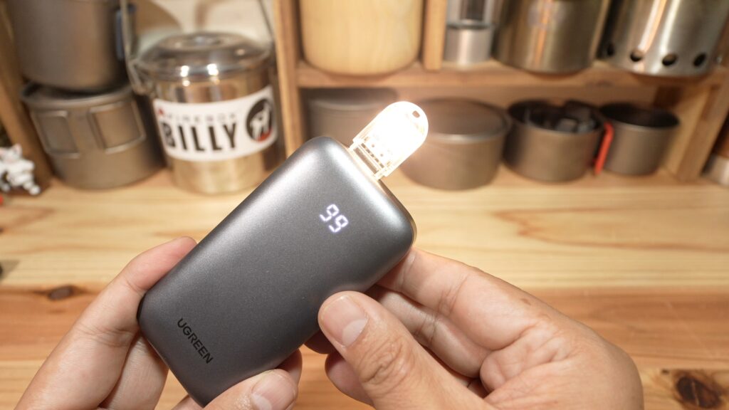 USBポートに直接差すだけで点灯し、モバイルバッテリーがあればどこでも明かりが確保できます。全長43mmと超コンパクトで、予備として持っておくと安心です。