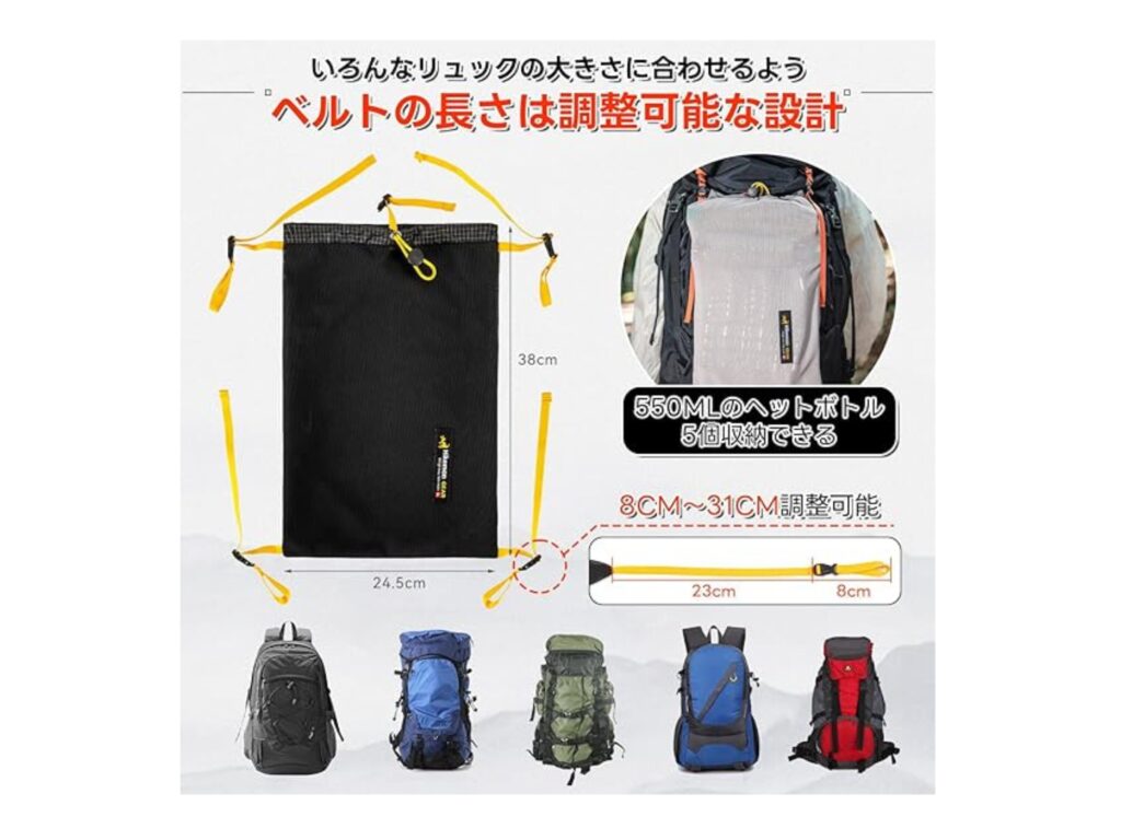 4隅のベルトは長さ調整可能で、様々なザックに対応。商品説明を見る限り、40Lクラスのザックにもしっかりフィットして、激しく動いてもズレにくい設計になっています。
